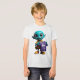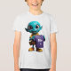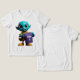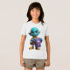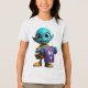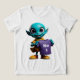 "This fun and quirky design features a bright blue cartoon alien with large, friendly eyes and a cheerful smile, holding up a plain purple t-shirt. The alien is also wearing a yellow hooded shirt and yellow shoes with red accents. This playful character has a lighthearted and engaging appearance. This design is perfect for a range of products, especially those related to clothing or showcasing a fun and imaginative style. Imagine it on apparel, tote bags, stickers, or designs for online merchandise stores."