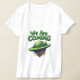 A design apresenta 'Estamos Vindo' em texto foliar ousado, em forma de folha, com uma espaçonave alienígena enfeitada com padrões folhosos pairando sobre terrenos arborizados, enraizados, misturando natureza e tecnologia sem falhas.