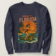 This kitschy throwback beach art is 'only in Florida' energy! A wild pin-up catches a wave as she rides an alligator like a surfboard. The surf beach at sunset scene has bold orange and red colors, complete with palm trees blowing in the tropical breeze. Add a little Florida chaos to your outfit with this fun sweatshirt. | Pro-Tip: For vibrant colors we recommend vivid printing for most apparel. For white apparel select classic printing.