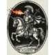 Um guerreiro com cabeça de leão cavalga um corcel cornudo, soprando fogo e brandindo uma arma pontiaguda. Uma figura imponente de autoridade mítica, que incorpora batalha, espetáculo e força sobrenatural.