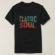 A design da camiseta canaliza as vibrações da alma do eterno com a frase "Soul Clássico" exibida em uma paleta legal e multicolorida. Imagine um "Clássico" ousado em uma cor contrastante a uma "Alma" mais cheia de azuis, púrpura, ou até mesmo um toque de ouro. As próprias letras podem ser na moda mix de matizes, ou cada palavra pode ser um solteiro, cor profunda com um toque ligeiramente angustiado ou vintage.