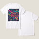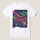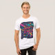 A design da camiseta apresenta o texto "Alma de Jogador" em uma fonte ousada, neon, rodeada por padrões psíquicos girando em estilo caleidoscópio. As cores vibrantes e a intrincada design criam uma peça visualmente impressionante e enérgica, celebrando a paixão e o espírito dos jogos.