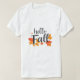 Um na moda, design de tipografia "Hello Fall" escrita à mão, adornado com laranja vibrante e folhas amarelas do mapa em cores do outono. O fundo preto torna o texto e deixa de lado, fazer adequado para ilustrações, posters, cartas ou conteúdo de mídia social.