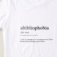 Camiseta simples, moderna e minimalista em um design de definição de dicionário preto e branco. Apresentando as palavras "Abibliofobia, substantivo falso. Um medo de ficar sem ler material. Muitas vezes, resolveu-se comprando mais livros."