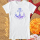 Design náutica cúbica com uma âncora de Kedge. A forma da âncora é composta por uma variedade de figuras divertidas do oceano, incluindo peixes do sol, lula, polvo, rodas do navio, âncoras, lagostas e caranguejos. As figuras do oceano são vários tons de azul. Embaixo da âncora do barco estão as palavras: Nome ama Amelia Island. Esta camisa está pronta para uma diversão séria na Flórida ao sol.