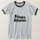 A design de camiseta apresenta um fundo pitoresco com silhuetas de amigos em várias aventuras, como caminhadas, ciclismo e acampamento. O slogan "Amigos e Aventuras" é exibido com destaque em uma letra lúdica e aventureira, simbolizando amizade e descoberta.