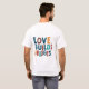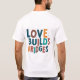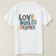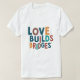 Esta t-shirt apresenta uma mensagem de unidade e ligação. "Love Builds Bridges" é escrito em uma fonte divertida e multicolorida, com as letras conectadas por caminhos bobos que se assemelham a pontes. O design é vibrante e cheio de energia, perfeito para espalhar uma mensagem positiva.