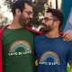 Arco-íris brilhante simbolizando orgulho gay com o texto inclusivo Love Is Love. A camisa é unisexa e a imagem pode ser transferida para outros estilos de camisa ou outros produtos.