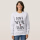 O amor nunca falha em uma bela tipografia com um coração de padrão de xadrez vermelho e preto. Esta design é baseada em 1 Corintianos 13:8. Esta design serve de roupa para toda a família - por isso, vejam o nosso compro por camisas familiares, camisas de suor e capuzes. Também está disponível para bebês e Decoração Doméstica! Venha ver nossa coleção!
