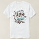 Esta t-shirt explode com a vida! As palavras "Love, Laugh, Live" são espalhadas pela frente num arco-íris de fontes ricos. Cada palavra tem seu próprio estilo único, talvez "Amor" escrito em um guião fluente, "Ria" em uma fonte divertida e bolha, e "Viva" em uma fonte ousada e esboçada. As cores vibrantes e o texto divertido criam um design que certamente difunde positividade onde quer que você vá.