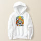 Um Hoodie encantador com um arco-íris no céu, com animais adoráveis — pandas, girafas e pinguins — espiando por trás das listras coloridas. O sol brilha intensamente, e o texto diz, "Seja feliz."