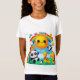 Uma camiseta encantadora com arco-íris no céu, com animais adoráveis — pandas, girafas e pinguins — espiando-se por trás das listras coloridas. O sol brilha intensamente, e o texto diz, "Seja feliz."