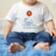 Camiseta de aniversário de 1 ano dos Meninos Dinossauro apresenta um dinossauro azul pastel segurando um balão vermelho com o número 1 dentro do balão em um cenário colorido e divertido com tema de dinossauro. Personalize com a idade e o nome da criança.