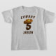 Design apresenta o nome da criança, exibido como um arco em letras marrons no topo. O nome da criança aparece abaixo. O design central consiste na idade da criança com um chapéu de vaqueiro no topo. Todo texto é marrom-escuro. Perfeito para uma festa de aniversário de temas ocidentais.