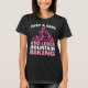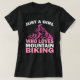 Este design apresenta uma camiseta preta com um gráfico de uma pessoa montando montanhas rosa sobre montanhas rosa. Acima do gráfico está o texto "APENAS UMA MENINA" em branco. Abaixo do gráfico encontra-se o texto "OMS AMOR" acima de "MONTANHA" e "BIKING" a rosa.