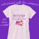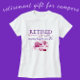 Um trailer de camper vintage fofo, com tolices rasgados, corações e uma gaiola de pássaros em uma das janelas. As palavras: RETIRED e acampamento alegremente para sempre, estão acima do divertido e alegre trailer de viagem. O design é rosa e roxo. Celebre a sua aposentadoria e brinque a si mesmo ou a um amigo.
