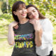 Esta camisa é alegre — inspirada pelos Philippians 4:4 na Bíblia "Realegria no Senhor sempre. E, mais uma vez, eu digo 'Rejoice'!". Um estilo ligeiramente psicodélico, definitivamente colorido e moderno — com efeito de confete amarelo, roxo, turquesa e verde, amarelo. Proclamem a vossa determinação em regozijar-se com todas as coisas, porque Ele está, em última análise, no controlo!