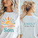 Aqui vem a Mamãe-a-ser-camisa | Camisa de Chá de fraldas retrô Celebre a mama em estilo com esta adorável camiseta de chá de fraldas "Aqui Vem o Filho", projetada para combinar perfeitamente com seu tema ensolarado de praia retrô! Apresentando a assinatura do sol e palmeiras na frente, esta camisa é uma na moda e confortável escolha para o convidado de honra. A parte de trás da camisa inclui um texto editável para o nome da futura mãe acima da frase "Mamãe-to-Ser", fazer-o um toque pessoal e significativo para a celebração do seu chá de fraldas. Quer você esteja jogando uma praia, uma festa tropical, ou um chá com temas-boho, esta árvore é perfeita para fotos, mesclagem e encharcando o amor. Detalhes: Coordena com a coleção de chás de fraldas "Aqui Vem o Filho" Retro sun e design de praia na frente Nome editável e texto "Mama-a-Ser" no verso