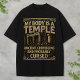 This vintage-style design features a crumbling ancient temple surrounded by rubble, with distressed stone lettering that reads: “My Body Is a Temple – Ancient, Crumbling, and Probably Cursed.”