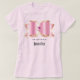 T-shirt com um arco brilhante brilhante brilhante com contorno de ouro e uma pedra-pomes rosa facetada no centro. Estilo de luxo feminino.