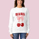 Adote o estilo de coquete lúdico com este Arco rosa e design vermelho de cereja. Emparelhe-o com os seus jeans favoritos para um olhar de cama e na moda e faça todo dia um pouco mais encantador! Ou um par com calças de PJ de xadrez vermelha para fazer um jogo de pijama. Este estilo desenhar em imagens retrô com talento moderno. Texto: "MAMA". Siga os prompts se quiser personalizar o texto para dizer "Mãe", "Não-na", "Não-na" ou qualquer outro nome (máximo de 5 a 6 letras).