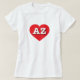 Esta t-shirt contém um coração vermelho vibrante contendo as letras maiúsculas brancas em negrito AZ, abreviatura oficial do estado da Arizona.