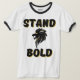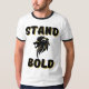 Esta camiseta de dedo tem um design que exibe as palavras "Stand Bold" em uma impressão com letra em negrito com letra preta sobre uma sombra colorida de ouro com um ícone de leão preto e dourado no centro neste tema de citação bíblia baseado em fé. Esta tenda tem um olhar inspirado na safra, com algemas e colchetes contrastantes para um olhar esportivo, mas casual.