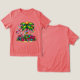 T-shirt com uma imagem de férias sazonal. Uma palmeira tropical decorada em luzes festivas com uma estrela no topo. Uma bengala branca e vermelha gigante que sai da areia. Presentes de Natal debaixo da árvore. Whimsical e divertido.