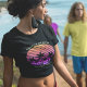 Camisetas de férias de família legal para uma viagem de raparigas a uma ilha tropical. Apresenta belas palmeiras em frente a um pôr do sol bonito rosa da praia. Camisetas personalizadas perfeitas para o seu cruzeiro ou viagem de verão para o mar.