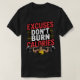Esta camiseta preta apresenta o texto "EXCUSES DON'T BURN CALORIES" em uma fonte vermelha e branca, em negrito, ligeiramente angustiada, com sotaques amarelos. Abaixo do texto está um gráfico de um indivíduo muscular, que parece ser um homem de pele clara, levantando uma campainha. O design é motivacional e temático malhação, encorajando o exercício sobre desculpas de fazer.