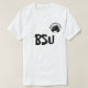 Camisa branca da curto-Capa com impressão preto de "BSU" com logotipo no lado superior esquerdo.