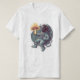 Design de camiseta surpreendente com um astronauta segurando um cogumelo brilhante enquanto voava no espaço.