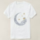 Trabalho de arte minimalista de um astronauta sentado numa lua ouro crescida com estrelas. Uma peça moderna e sonhadora para entusiastas do espaço.