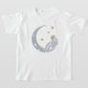 Trabalho de arte minimalista de um astronauta sentado numa lua ouro crescida com estrelas. Uma peça moderna e sonhadora para entusiastas do espaço.