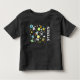 Camiseta de menino de aniversário com um padrão bonito e colorido com todos os tipos de elementos temáticos do espaço exterior. Imagens incluem astronautas flutuando em seus trajes espaciais brancos. Estrelas e planetas e pequenos navios de foguetes legal, naves espaciais e satélites. Diversão e design maluco.