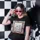Camiseta preta básica de mulheres, com Alice branca e preta de vintage na Terra Maravilha, imagem de Alice sob ataque dos Cartões em um quadro preto e branco de tabuleiro de xadrez, sobre um fundo de cartas de jogar em vermelho. Veja toda a coleção de Roupa Wonderland nos TOUCHES ESPECIAIS | Seção Favoritos para festas.