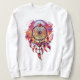 Bonito diseño de un atrapasueños, plumas y luna llena, inspirada en el arte místico y la conexión con los sueños. Estilo boho chic espiritual, con paleta de tonos vibrantes fucsias, lilas, dorados rayos del sol paciendo. Ilustración en acuarela digital, ideal para mujeres que visten con intención