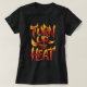 Um design gráfico da frase Aumente o calor com as letras estilizadas para se assemelharem a chamas, em laranja e vermelho.