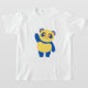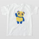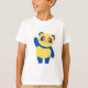 Um panda giro e estilizado com um corpo amarelo brilhante e membros azuis sobre um fundo branco, balançando sua pata esquerda em uma saudação amigável. O panda tem orelhas e manchas oculares laranja, e um rosto simples e sorridente com um nariz e boca pequenos.