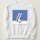 Um design unisexo. Um desenho de linha in a box de um gato com as costas viradas e a cabeça inclinada para um lado, com fundo azul. Os tons azuis e afiados no corpo dos gatos agregam interesse e forma ao desenho, representando seu pelo. A afirmação "Perfeito exatamente como você é!" pode ser personalizada.
