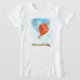 Um balão de ar quente cor de laranja brilhante, transportando 2 silhuetas. O céu é uma combinação de pinks e azuis giratórios e o chão abaixo é coberto por montanhas e uma floresta de árvores.