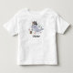 Esta camiseta personalizada para crianças pequenas apresenta uma baleia narval de desenho animado encantadora e divertida com uma expressão caprichosa, usando um pequeno chapéu de pirata adornado com uma caveira e ossos cruzados. Acessórios divertidos com tema oceânico, como um baú do tesouro, estrela-do-mar e bolhas flutuantes rodeiam a baleia narval.
