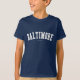 Verifique para fora este t-shirt de Baltimore! É você de Baltimore, Maryland? Você tem um amigo ou um membro da família que amem Baltimore, Maryland? Em caso afirmativo, este t-shirt da "bandeira" é exatamente o presente que você está procurando! As características de design "Baltimore" na rotulação branca arqueada na pia batismal clássica da faculdade.