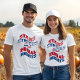 Uma camiseta personalizada para toda a família para a comemoração de 4 de julho. O padrão tem estrelas e listras em vermelho, branco e azul. O nome no verso pode ser personalizado.