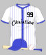 Um design de baseball bonito. Apresentando na frente uma camisa de beisebol listrada, azul e branca, que pode ser personalizada com um nome e número, um boné de baseball azul, baseball e taco de beisebol. O fundo apresenta um campo de beisebol. Podemos criar este esquema de cores design que você precisa, apenas entre em contato conosco através de nossa loja de giftsbonanza antes de comprar
