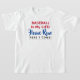 Beisebol divertido é a minha corrida em casa, aqui eu venho. Tipografia mista vermelha, azul e preta. Design vermelho, branco e azul. A parte traseira tem Número no círculo preto dentro vermelho (clique em Personalizar para editar a camada e remover para deixar o vazio). Design original de TamiraZDescartazes.