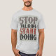 Esta camiseta clássica e confortável é uma obrigação para qualquer guarda-roupa. É feito de algodão macio e durável e apresenta um design eterno que nunca sairá do estilo. O ousado gráfico "Stop Talking, Start Doing" na frente é um poderoso lembrete para tomar medidas e fazer as coisas acontecerem.
