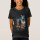 A lone explorer stands on an alien landscape beneath a ringed planet and a mysterious cosmic signal piercing the night sky.