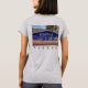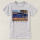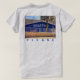 Beber COFFEE dormindo mais tarde - Em letras brancas vestidas sobre um fundo azul cobalto pintado em uma parede de tijolos, a placa na fotografia original de ZoeSPEAK nesta camiseta para amantes de café diz tudo. O pequeno compro, com uma palmeira à frente e um telhado entalhado atrás, está caindo à luz do sol da tarde. Sob a foto do café está a palavra PLEASE (ou seja, sim, gostaria de um café!).