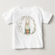 Esta camiseta adorável apresenta uma ilustração esbranquiçada de um coelho bebê. Ele está vestido com sua pequena jaqueta azul e segurando um monte de cenouras. Ele está cercado por uma coroa de folhas minúsculas. Isso também está disponível em um traje corporal.